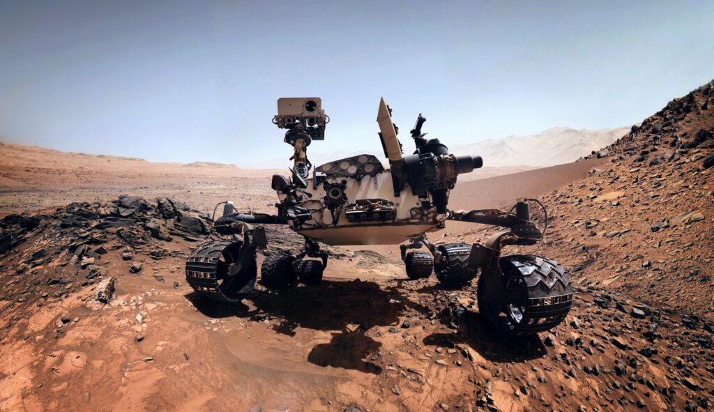 Captura impressionante do Curiosity com o relevo marciano ao fundo ― perfeita para mostrar o pioneirismo robótico em solo marciano.